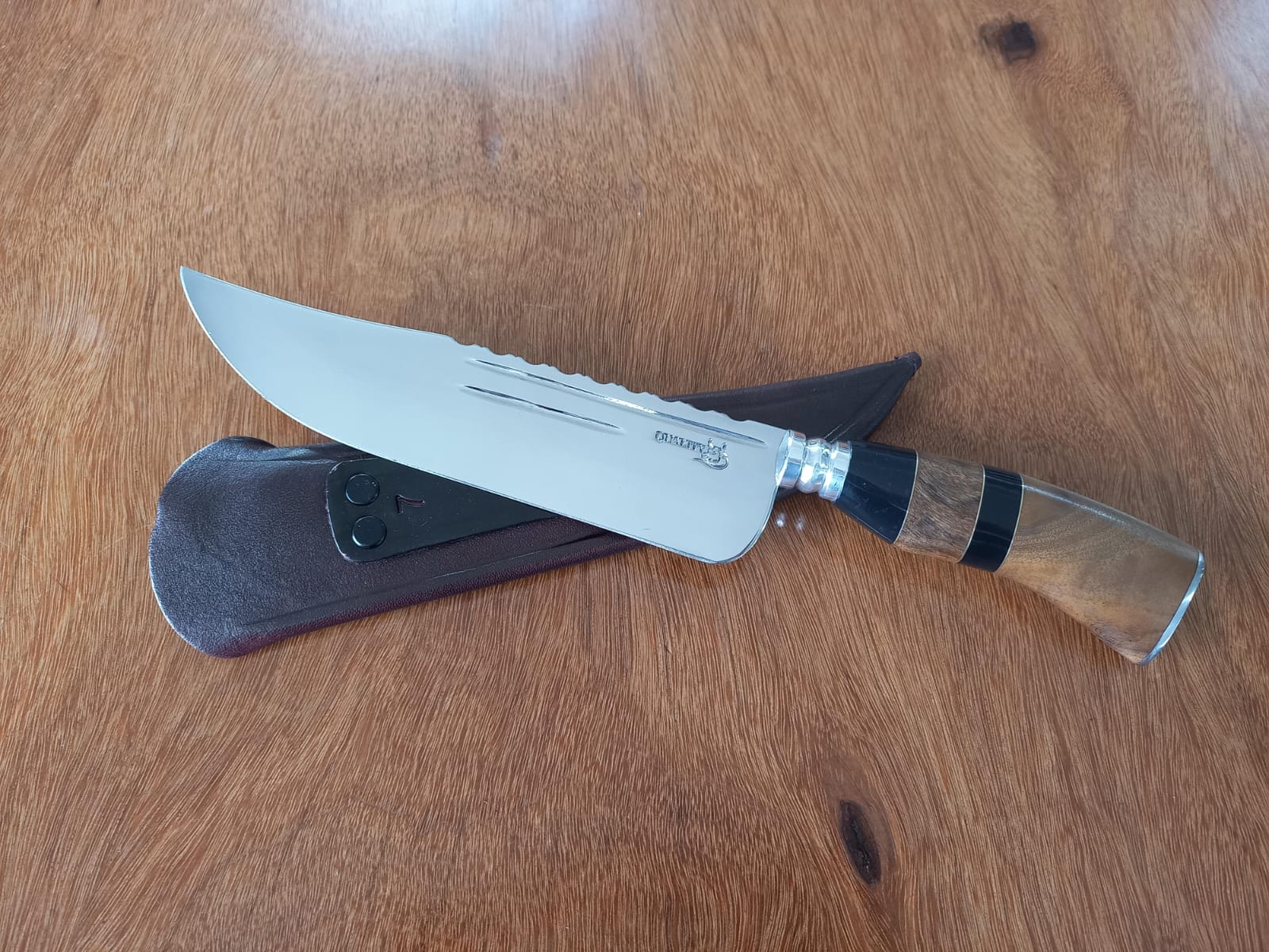 - Acompanha uma bainha trabalhada em couro, oferecendo proteção e praticidade;