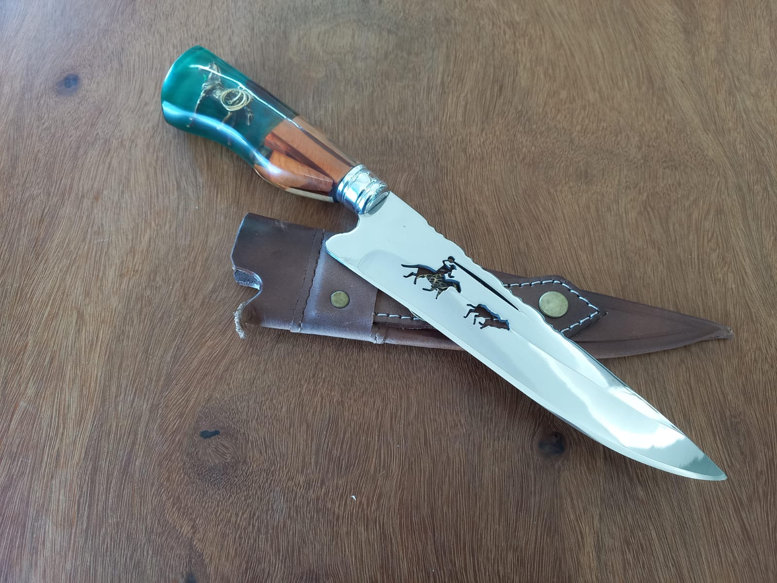 Lâmina: Com figura LAÇADOR cortados a laser. Push tang, onde parte da lâmina se estende até metade do cabo, polida e limada no dorso;