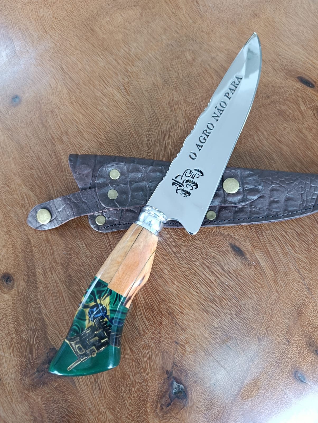 Lâmina: Com figura AGRO É TOP cortados a laser. Push tang, onde parte da lâmina se estende até metade do cabo, polida e limada no dorso;