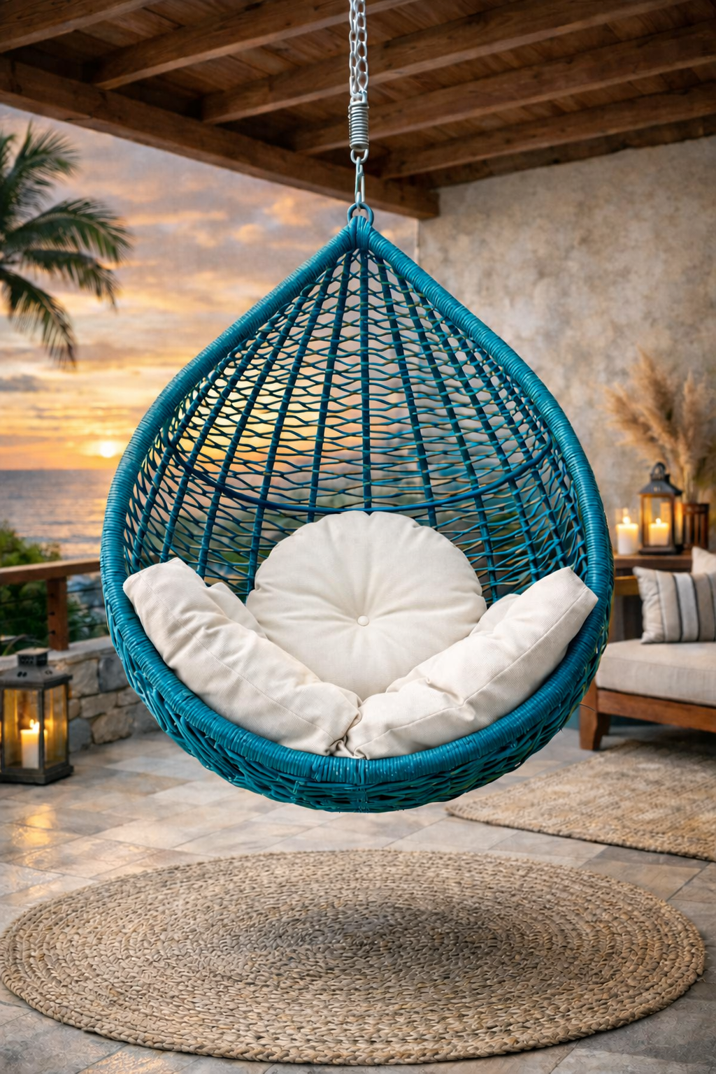 Produzido com estrutura em alumínio, oferece leveza, resistência à corrosão e segurança no uso. Pode ser instalado pendurado em viga, teto ou estrutura fixa adequada. A trama envolvente, aliada às almofadas em couro náutico, proporciona uma experiência confortável e aconchegante, perfeita para momentos de descanso e relaxamento. Uma peça que valoriza varandas e áreas de lazer com estilo e personalidade.
