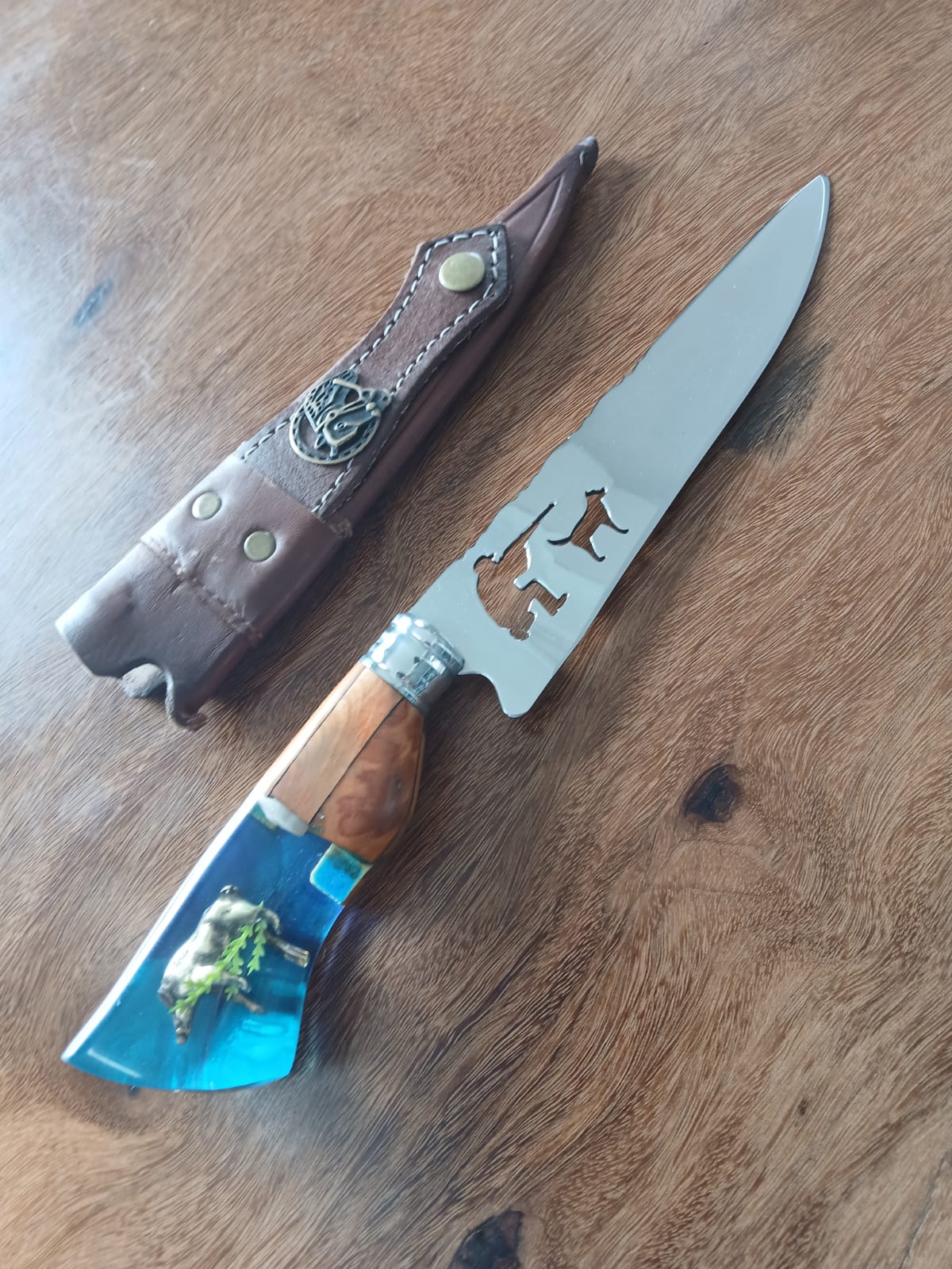 O cabo com tema de caça ao javali traz um design exclusivo e firmeza na pegada, unindo estilo e funcionalidade.