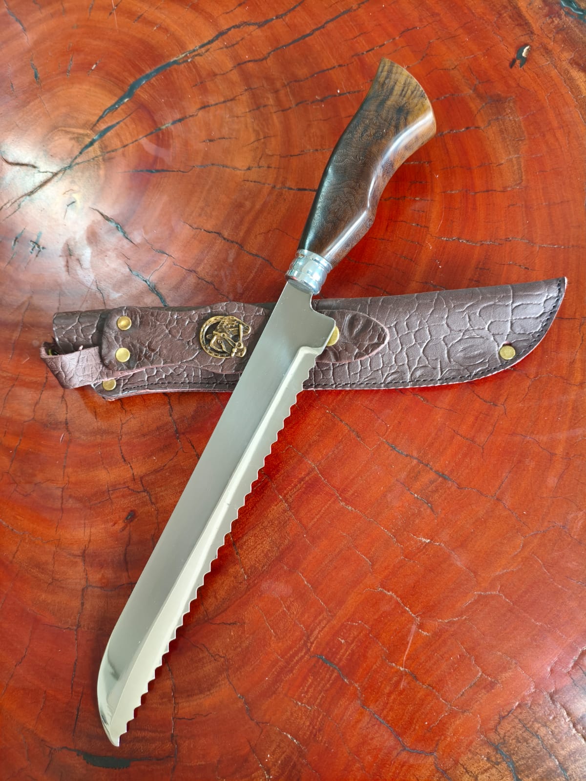 Faca de pão artesanal com 10 polegadas de lâmina, ideal para quem valoriza corte preciso, durabilidade e um acabamento impecável.