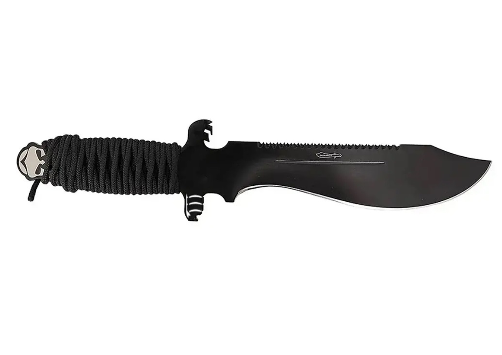 O cabo, revestido em corda, assegura firmeza na empunhadura e pode ser utilizado em emergências, como prender equipamentos, montar acampamentos ou improvisar soluções em campo.
