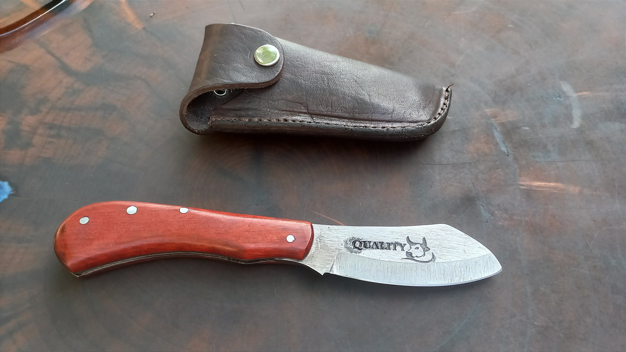 Canivete forjado artesanalmente em aço carbono 5160, construção full tang, cabo em Madeira Pau Brasil. Lâmina com tratamento térmico (tempera) de excelente qualidade, propiciando para o canivete maior resistência mecânica e durabilidade de fio, com acabamento polido. Canivete adequado para o uso diário, podendo atender atividades com ampla funcionalidade, no churrasco do final de semana, na carneada, no uso do campo e da cozinha. Bainha também artesanal, confeccionada em couro.