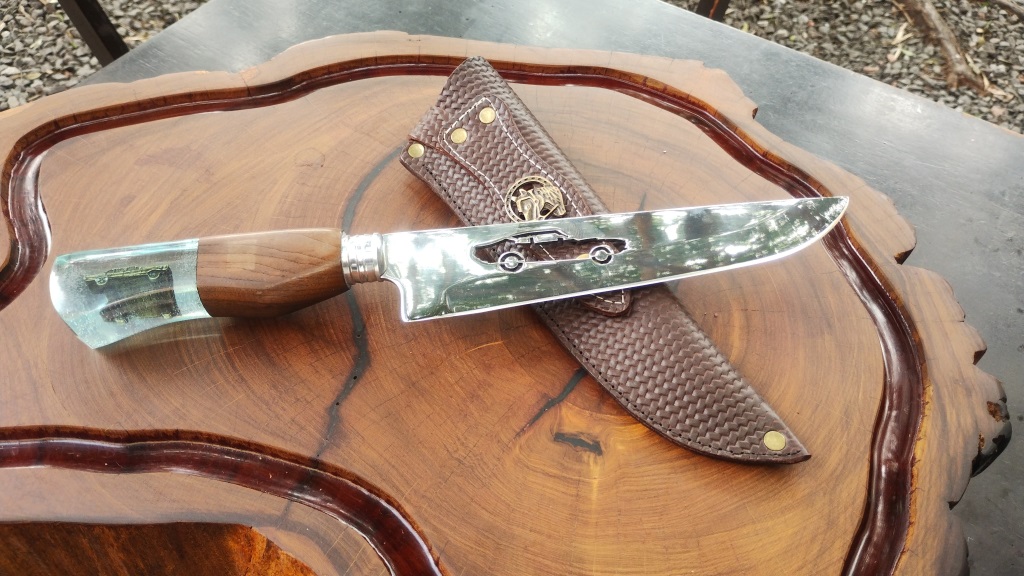 Lâmina: Com figura CARRO cortados a laser. Push tang, onde parte da lâmina se estende até metade do cabo, polida e limada no dorso;