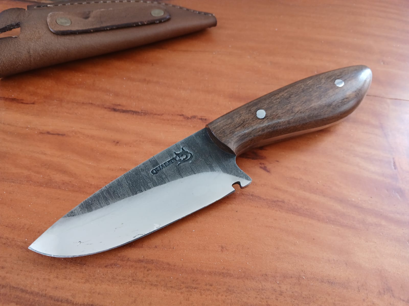 Faca ”EDC” confeccionado artesanalmente em aço carbono 1070, construção monobloco (full tang), cabo em madeira de Imbuia. Lâmina com tratamento térmico (tempera) de excelente qualidade, propiciando para a faca maior resistência mecânica, durabilidade de fio e acabamento bruto. Faca adequado para o uso diário, com facíl porte, podendo atender atividades com ampla funcionalidade. Bainha também artesanal, confeccionada em couro. Lâmina: 10 cm. Cabo: 9,5 cm. Espessura: 5 mm. (Aproximadamente) Largura: 3,6 cm. (Aproximadamente)