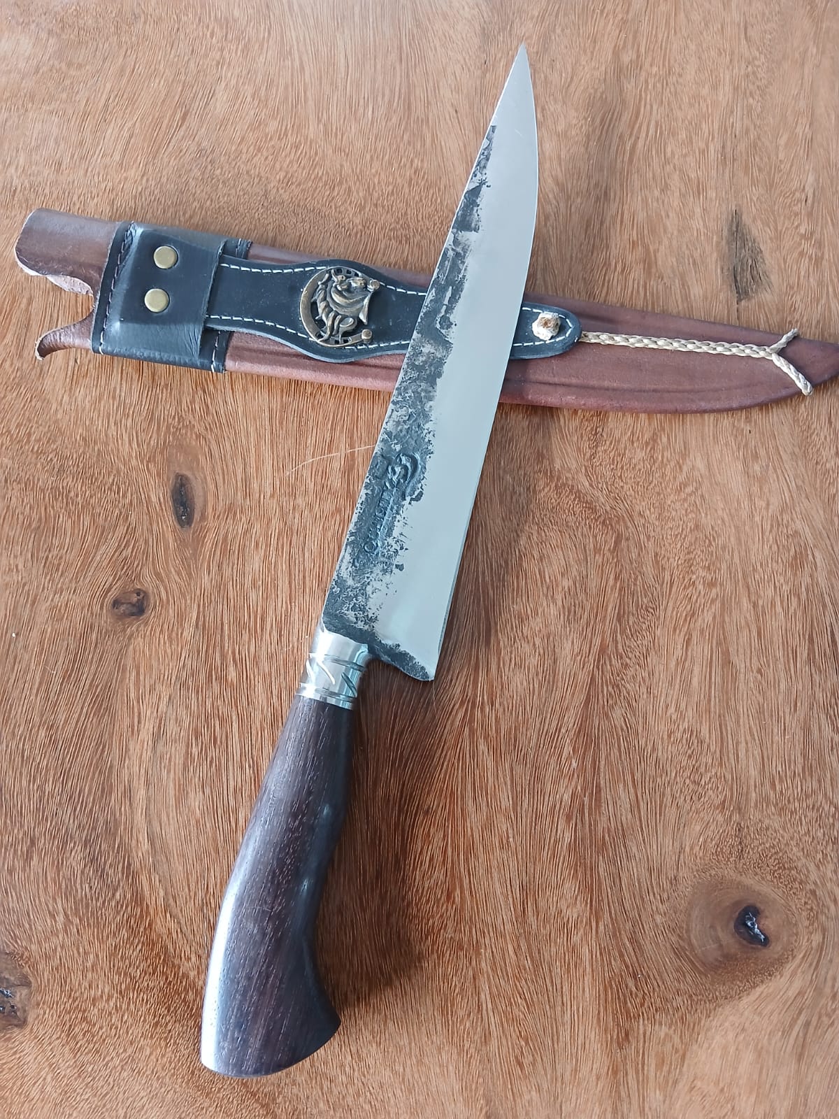 Faca forjada artesanalmente em aço carbono 5160, construção integral, cabo em madeira . Lâmina com tratamento térmico (tempera) de excelente qualidade, propiciando para a faca maior resistência mecânica e durabilidade de fio e acabamento brut forj. Faca adequada para o uso diário, podendo atender atividades com ampla funcionalidade, no churrasco do final de semana, na carneada, no uso do campo e da cozinha. Bainha também artesanal, confeccionada em couro . Lâmina: 23,5 cm. Cabo: 12 cm. Espessura: 5,5 mm. (Aproximadamente) Largura: 4,2 cm. (Aproximadamente)