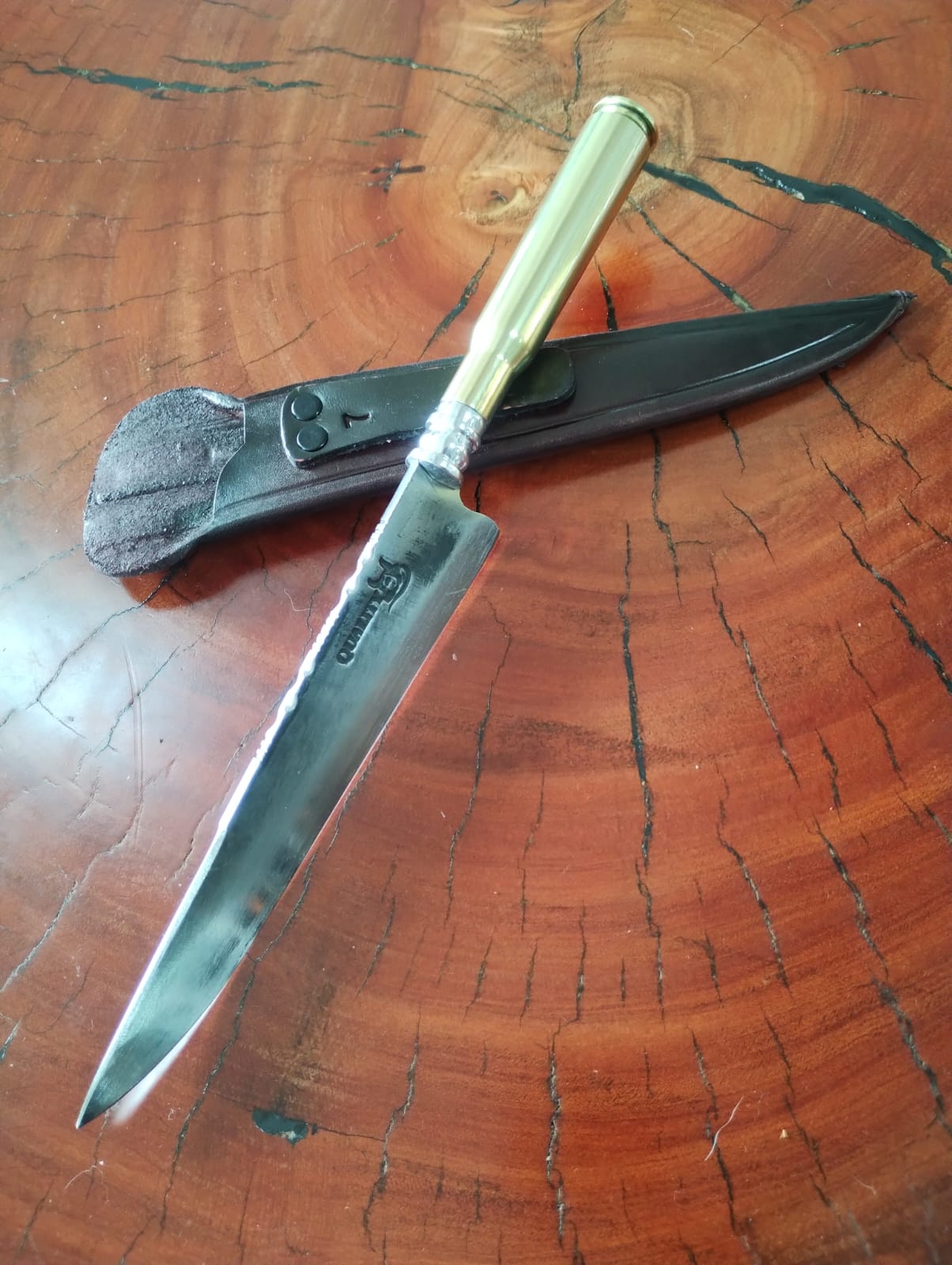 Faca artesanal feita à mão, com cabo feito a partir de cartucho de calibre .50 desativado.