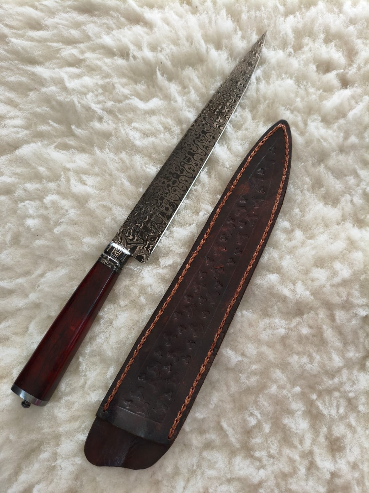 🔥 Faca Forjada em Aço Damasco 10,5 Polegadas de lâmina e o cabo em Pau-Brasil – Exclusividade, Resistência e Elegância